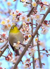 白梅の枝にメジロ。視線は遠い大空。「ボチボチ。俺も羽ばたこうかなー」