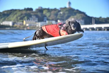サーフィンだワン!その2 肌寒い中ダックスくんに頑張ってもらいました。少しプルプルしてました。寒いのか、それとも怖いのか?波と目線のタイミングで良く撮れました♪ Z6,Z24-70F4ハウジング使用