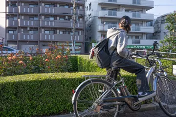 神戸市東灘区にある小さなバラ園 少女が自転車に乗ってスマホで腹を撮影している
