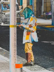 ソラリゼーション的な表現で並行世界的な表現を発信。 道端でウエストに構えたカメラ。ナイスショットは撮れたのかな?