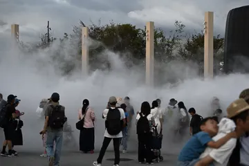 日差しがまだ強い午後、ミストシャワーが嬉しい万博会場にて。 30 September 2025