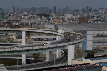 大阪市大正区、新木津川大橋 大阪市大正区と住之江区を結ぶ「新木津川大橋」の大正区側・大正区側は見ての通りループ橋(3回転して登るので、車の場合慣れないと目が回ります)・住之江区側はなだらかな直線歩いても渡れる(今回は歩いた)が、橋の袂には未だ「渡船」が現役で残っている