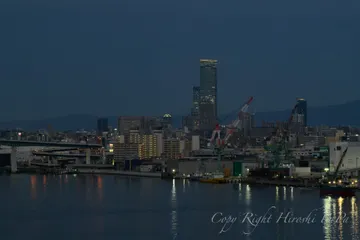 川のある夜景 新木津川大橋からの夕景左手のループ橋は大阪市大正区と西成区を結ぶ「千本松大橋(通称眼鏡橋)」中央左の高層ビルは「あべのハルカス」手前の水面は海でなく「木津川」