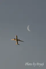 三日月と飛行機 今朝、ちょっと早起きして近所の広い公園に出かけました。日の出前のため、きれいな月(正確には月齢24日とのこと)が出ていました。日の出の写真を撮り終わったころ、飛行機が月の近くを通るのに気づき、撮ったものです。もう少し早く気づけば、まだ明るく輝く月と、朝日に輝く飛行機を撮ることが出来たんじゃないかしら