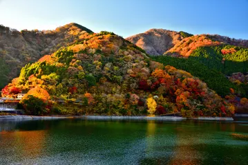 丹沢湖で撮影しました。夕暮れ間近の低い日差しに照らされた丹沢の山々が紅葉を照らしとても美しい光景でした。