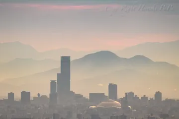微かに赤く染まった雲に浮かびあがる二上山が幻想的