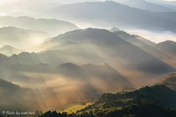 志国の夜明けぜよ ここは彩雲の眠る空・・・太平洋から上る朝日に照らされた山麓の風景雲海は出ませんでしたが光のシャワーに里山が包まれていきました。 D5 + 70-200mmF2.870mm 1/640s f11 ISO280