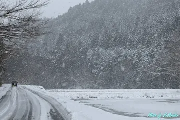 氷瀑を撮影した帰り道降りしきる雪と、薄っすら雪化粧をした景色が気になり車を停めたたまたますれ違った車が、良いアクセントになってくれました 今となっては平地に雪が積もることはないエリアに住んでいますが、50年程前は平地でも雪が積もることは良くありましたそんな懐かしい景色やはり温暖化なんでしょ