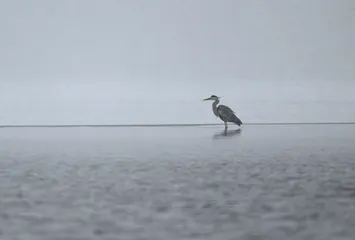 冬色チャレンジ(修行?) 寒風、積雪、凍てつく川の三重苦の鷺一匹。修行僧の様。