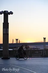 朝のお台場ー朝日の中 先日の早朝、お台場の夜明け時を狙って、寒さこらえて行ってみました。日の出時間の30分前に着けたので、「さて、きれいな朝焼けの中、どんな写真が撮れるかなぁ」なんて、期待は大きく膨らんだのですが、想像していたイメージの写真は撮れず、足取りの重い帰宅となりました。