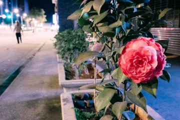 台北の中心部を南北に貫く大きな通り、夜の松江路にて、鉢植えに咲く花。■撮影日:2026年3月12日(木)■カメラ:Z8■レンズ:Z24-120mm f/4S■焦点距離24㎜ f/8 1/8秒 IS06400■Lightroomで現像