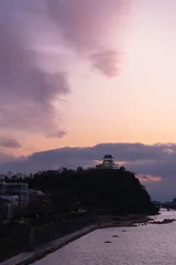日本最古犬山城の夕景 川が夕暮れに染まって、城が淡い光を受けて浮かび上がる静かな時間