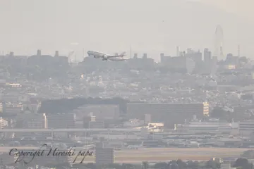 伊丹空港出発便、アンタが主役 伊丹空港の出発便この日は大気の状態が良く「ほぼメラ無し」のショットが撮れたが、まだまだ霞が多く遠くの背景はほぼ霧の中・・・滑走路/管制塔/タキシング中の機体を背景に離陸していくB787通常運用の離陸では離陸直後の機体が、70’万博の「太陽の塔(少々霞んでますが・・・)」&「大阪ホイール」と重なるぐん