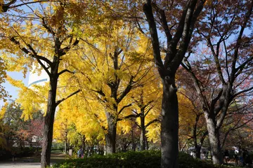 大阪城公園の秋 ポプラの黄色が日光に反射して輝いていた。また青空で黄色、赤、木の幹の黒 などが入り混じりバックにあるビルを見事に隠している。