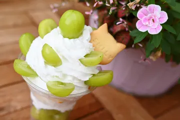 シャインマスカットパフェ 大分県の宇佐市にある期間限定店舗のシャインマスカットパフェ😊葡萄農家さんが直接出している店舗で、パフェや葡萄ジュース、その他スイーツも凄く美味しいです😊葡萄自体も各種販売されてます😊近くにお出かけの際は是非👍お店の宣伝みたいになりましたが、写真映えしそうなスイーツだったので撮影してみました😊