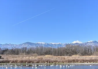 常念遠望、白き時 安曇野市にある御宝田(ごほうでん)遊水池は、信州を代表する白鳥越冬地です。彼方に北アルプスの常念岳が望めるここで、ゆっくり羽を休めています。そこへ南西の方角よりジョット機が飛んできました。 メンバーの方にお聞きします。快晴の状況下、PLフィルターを使った方がよかったでしょうか? NikonZ7