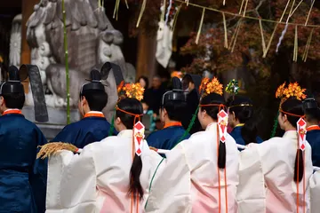 「秋色チャレンジ」巫女さんの秋 今日は、寒川神社の「新嘗祭」に行ってきました。 同祭は、五穀豊穣と産業振興を願い、また、秋の豊かな実りに感謝する祭典。崇敬者や地域の生産者らが丹精込めて作った白酒や新米、野菜、果物などが神前に奉納されます。巫女さんの頭飾りには、もみじの紅葉がありました。^^