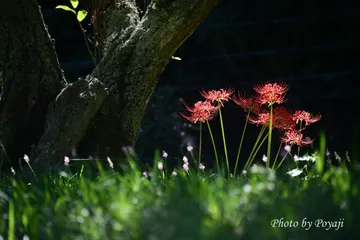陽だまり 9/26、伊勢原市日向薬師で撮ったものです。田んぼの脇に、ちょっとした梅林があって、その梅の木の葉陰で咲いていた彼岸花です。この辺りもご多分に漏れず、野生動物の害から作物を守るため、梅林、稲田を含めて電気柵などがはりめぐされていました。風景としては、ちょっと残念な感がありました。