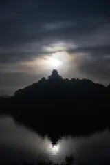神秘の夜明け 闇に包まれた木曽川に、夜明けの光を受けて浮かび上がる天守閣