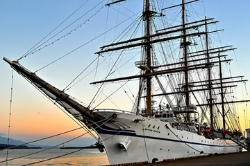 帆船「日本丸」 夕暮れ、うっすらとオレンジ色に染まる空をバックに鹿児島本港に停泊中の帆船「日本丸」を撮影しました。 Nikon Z9 NIKKOR Z 24~120mm f/4 S1/80 f/8 ISO1000