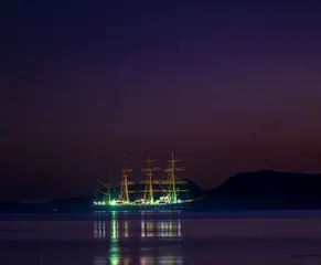 沈む夕陽にグリーンを乗せて 練習生達が操練する日本丸航海の無事を祈るかのようにヤードに沈む夕陽に幸せのグリーンを乗せて・・・ ズームしたら雲の影にグリーンが!