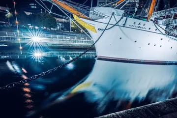 停泊中の帆船「日本丸」のライトアップと桜島フェリー。(鹿児島本港にて)Nikon Z9 NIKKOR Z 24-120mm f/4 S1/5秒 f/4 ISO400