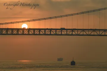朝日の昇る橋 名門太陽フェリーの新門司港発の第二便は明石海峡大橋付近で日の出を迎える最近のフェリーは巡航速度が速いので、特にこの季節は「寒い」「強風でカメラが持っていかれる」「朝日の時間帯は高湿度の塩風が吹き、瞬く間にカメラがネチャネチャになる」等々、結構過酷な撮影環境になる・・・
