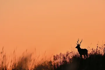 NEW 孤高の暁🌅🦌 朝焼けに染まる空🌅を背景に、立派な枝角を携えた一頭の雄鹿🦌が、丘の上で佇んでいました✨😳