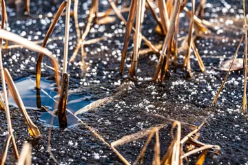 薄氷に雪散る 寒さで薄氷が溶けず、ハラハラと小さな雪が降ってきた。大雪に注意と言われる中、ありがたいくらいですんでいる。