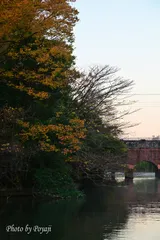 NEW 【秋色チャレンジ】穏やかな朝 珍しく気合を入れて、早起きし秋色を探しに出かけました。お目当てのレンガの橋では、空に朝焼け、水面にはうっすらとモヤが浮かんで、おぜん立てはそろっていると喜んだのですが、いかんせん、肝心の主役の紅葉がさみしく色付いた葉が大分散っていて、期待した絵とはなりませんでした。来年に期待ですね。