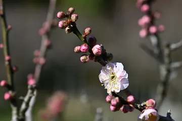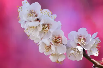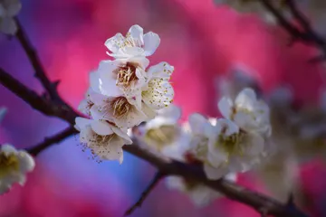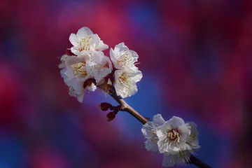 茅ヶ崎市小出川の梅、満開で今が一番美しく咲いていると思います。白い梅の花の背景は紅梅です。