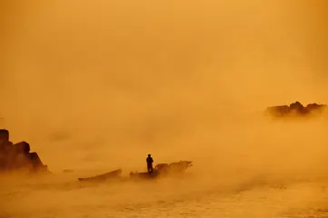 NEW 寒い朝 冬の海。一面に立つ気嵐をかきわけるように漁場へ向かう船。