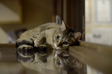 溶ける境界 行きつけの猫カフェにて。ガラスの上に乗っていたところを反射を活かして撮れました。 ボディ:NikonD7000レンズ:New Nikkor 50mm f1.4 撮影条件:f2.0, 1/40s, iso500