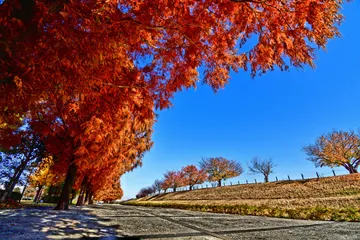 秋色チャレンジ」相模川のメタセコイヤ 平塚市相模川沿いのメタセコイヤの並木です。右手は桜並み木で更に右は相模川です。^^