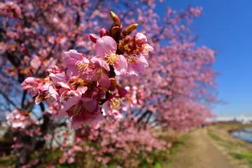 NEW 河津桜ウイーク(6) 茅ヶ崎市小出川添いの河津桜です。2月21日に撮影しました。未だ5~7分咲きでしょうか?それでもピンクに染まった並木がとても綺麗です。合成していない作品です。^^
