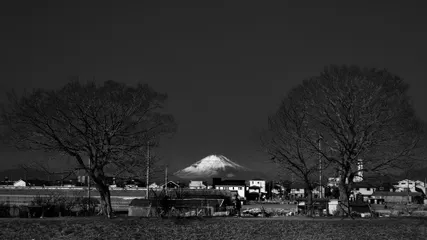 お散歩写真です。茅ヶ崎小出川沿いから撮影しました。モノクロ化して富士山の姿を際立たせました。^^