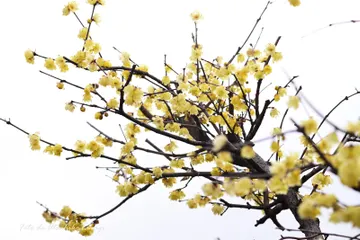空へ向かふ蠟梅(大阪・住吉公園) 蠟梅の木は、住吉公園内にある管理事務所の敷地内に一本だけ植栽されていまして、かなり太い幹にたくさんの花をつけていました。(2/15撮影)高さは3メールほどありましたが、目立たない場所にあるせいか私も最初気づきませんでした。三脚を立てて(この蠟梅の木に来る)野鳥待ちをしてる方々がいらっしゃったので、そ