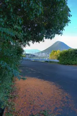 郷里に帰った時に撮影した金木犀の散った花びらと遠くに見える讃岐富士です。富士山と金木犀のコラボは撮影できませんでしたが、讃岐富士が代わりになってくれました。^^