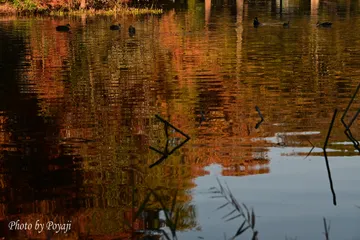 朝日を受けたメタセコイヤが水面に写り込んでいましたが、まるで池がきれいに赤く染められたかのようでした。