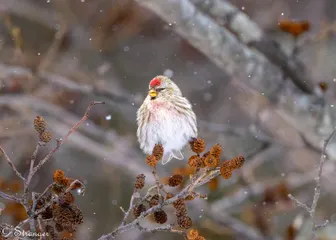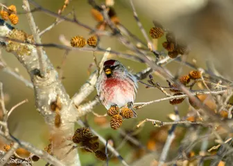 ベニヒワ ベニヒワのオス風が強く吹いていたので、しっかりつかまっているようでした。