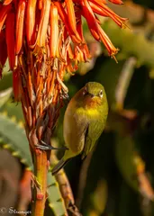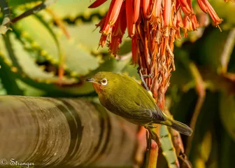 NEW 新種のメジロ⁉ アロエの花にいたメジロののどがオレンジ色だったので、驚いてしまった。撮影して、写真を拡大したら、アロエの花の花粉で汚れ、色がついていました。