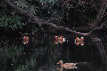 紅葉の名残が水面に映っている中を、オシドリたちが飛び去って行く姿を、スローシャッターで撮ってみました。