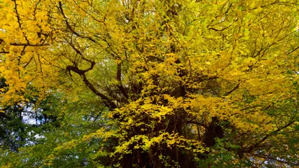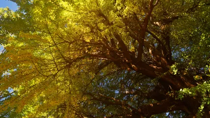 NEW 秋色チャレンジ」最後の輝き 鶴嶺神社で撮影した樹齢千年の銀杏の木です。落葉して木の葉も少なくなってきたようですが、最後の美しさを誇っている様でした。16:9でトリミングしています。^^