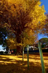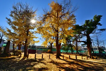 秋の日差しと公園 茅ヶ崎の三島神社で撮影しました。小さな神社です。神社に併設されている小さな公園の風景です。銀杏に差し込む柔らかな光と影が美しく感じられました。^^