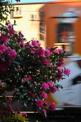 線路沿いの山茶花二景・壱 阪堺電車の線路沿い(東天下茶屋駅のすぐ近く)に山茶花が咲いていたのを見つけたので、昨日(12/16)上町台地の坂を上がって撮ってきました。一枚目は、線路沿いということもあり阪堺電車の通過を待って撮りました。狭い路地でしたので、NIKKOR-H Auto 28mm F3.5ですと後ろの壁ギリギリまで下