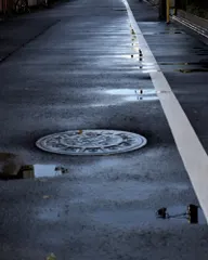 雨上がり 水たまりが途切れ途切れに映す電柱。 木枯らし吹く雨上がり。 こんな時でもカメラは街を「面白く」映し出します。