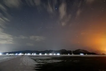 雪融けの朝に 当地は春には未だ早いと思うのですが、雪融けが進む早朝の水田?風景です。右のオレンジ色の光芒(ナトリウム灯?)はスキー場で始業になりました。PM2.5で低空は霞んでいます。f18mmF2.8D 絞り開放 露光13秒 ISO1600