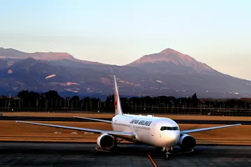 霧島連山と飛行機 霧島連山の高千穂峰をバックに到着したばかりのJAL機(鹿児島空港にて)Nikon Z9 NIKKOR Z 24-120mm f/4 S1/400秒 f/5 ISO80