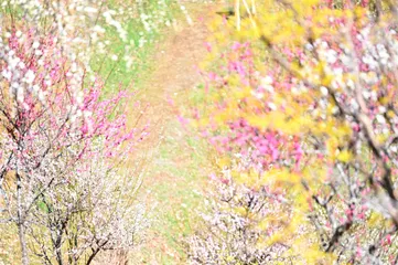 梅園のいろどり 梅園では、一輪の梅花、一本の梅の木、林をなす梅林など、どのスケールで眺めても美しく、心が休まります。色とりどりな梅園を絵の具を散らしたキャンバスのように眺めることも一興です。