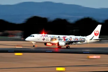 ユニバーサル・スタジオのラッピングを施されたJAL機の離陸をスローシャッターで。(鹿児島空港にて)Nikon Z9 NIKKOR Z 100-400mm f/4.5ー5.6 VR S1/25秒 f/8 ISO2500